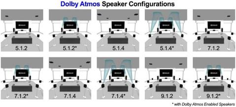 Tento systém funguje dobre, ale obmedzuje spôsob zmiešania zvuku, ako aj počet a usporiadanie hardvérových komponentov použitých na jeho prehrávanie. Z tohto dôvodu systémy priestorového zvuku takmer vždy prichádzajú do konfigurácie reproduktorov 5.1 alebo 7.1. Na druhej strane Dolby Atmos je škálovateľný a prispôsobivý systém. Soundtrack zmiešaný pre Dolby Atmos môže pracovať s 8 reproduktormi v 5.1.2. usporiadaní v domácom kine alebo s až 64 samostatnými reproduktormi vo veľkom kine. Na použitie v domácom kine sú však najbežnejšie usporiadania 5.1.2, 5.1.4, 7.1.2 alebo 7.1.4. Čísla sú rozdelené nasledovne: Najprv priestorové reproduktory, potom počet basových reproduktorov (zvyčajne 1) a následne stropné alebo upfirings reproduktory.